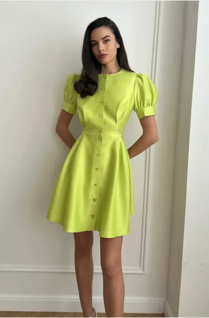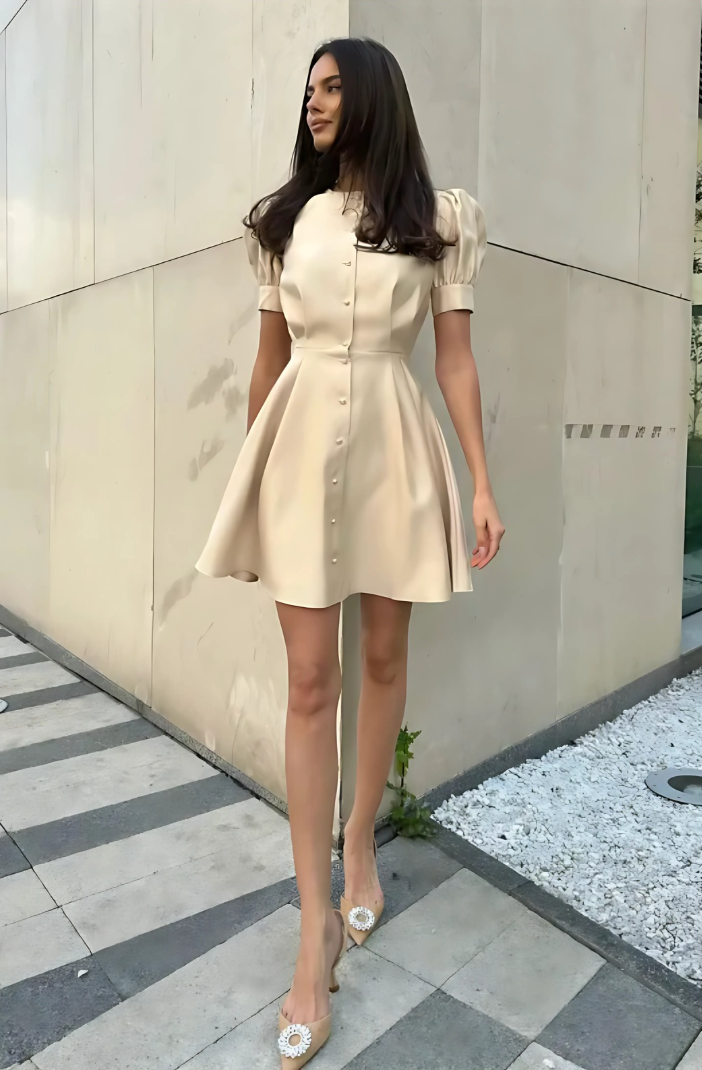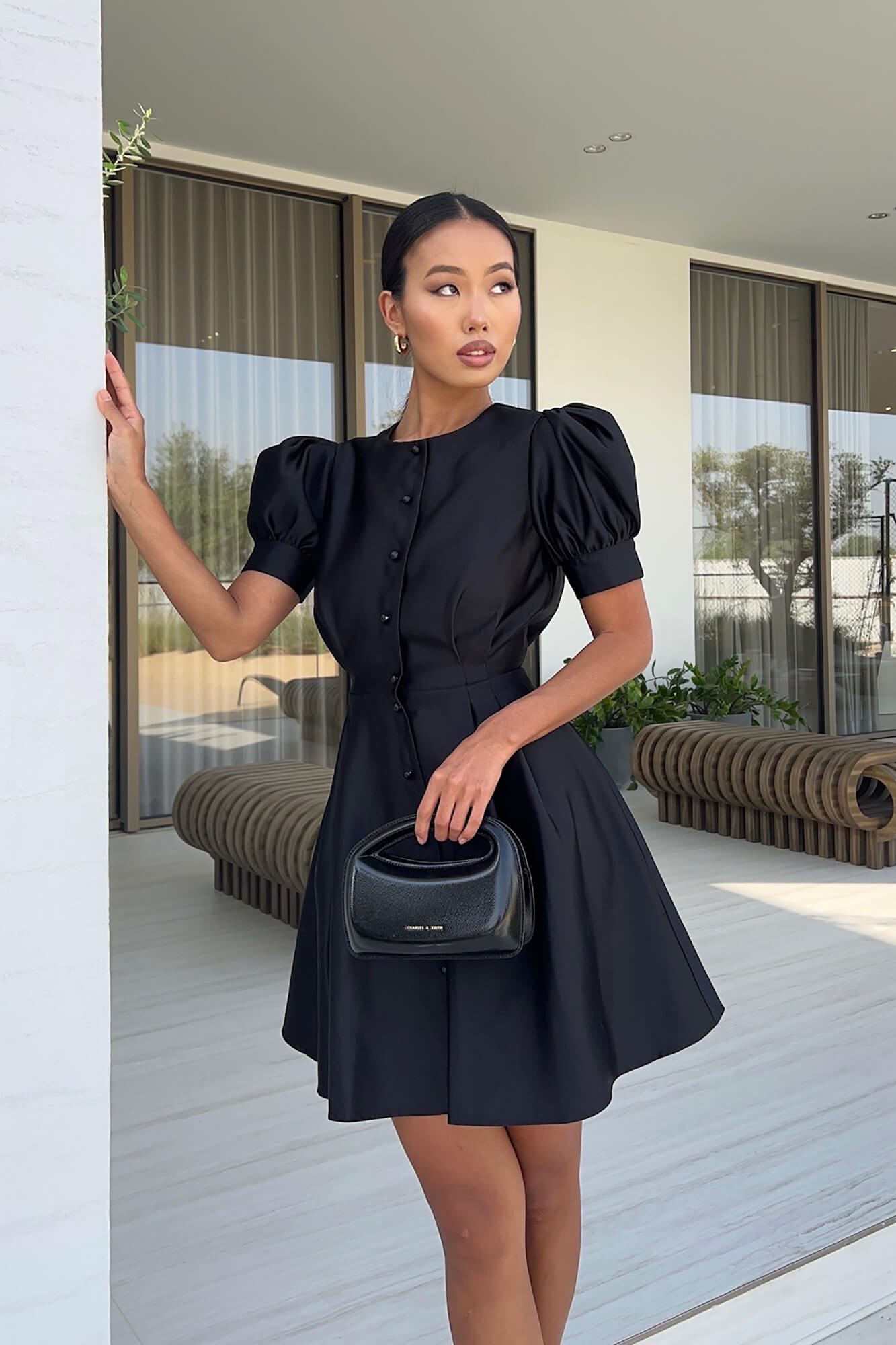 Känn den silkeslena satinen mot huden när du glider i Lova™, miniklänningen som förenar dramatisk volangkjol med lyxiga lyktärmsdetaljer. Föreställ dig själv i kvällsljusets sken, där varje knapprad och veck i midjan framhäver din silhuett och får dig att sväva fram.