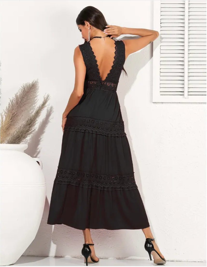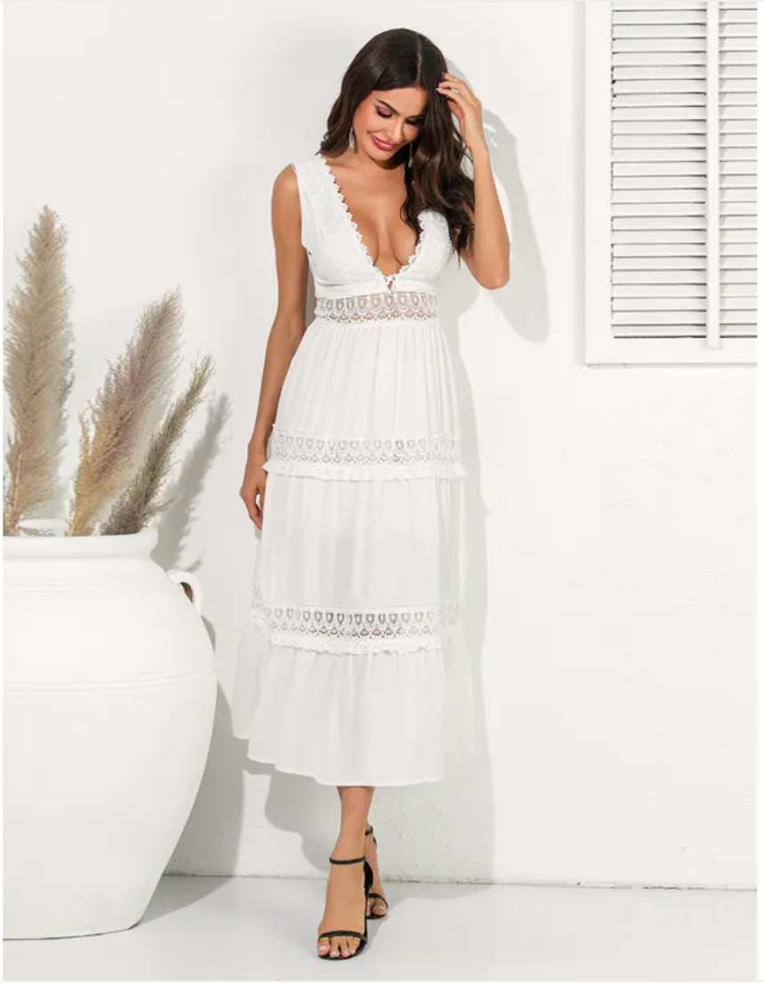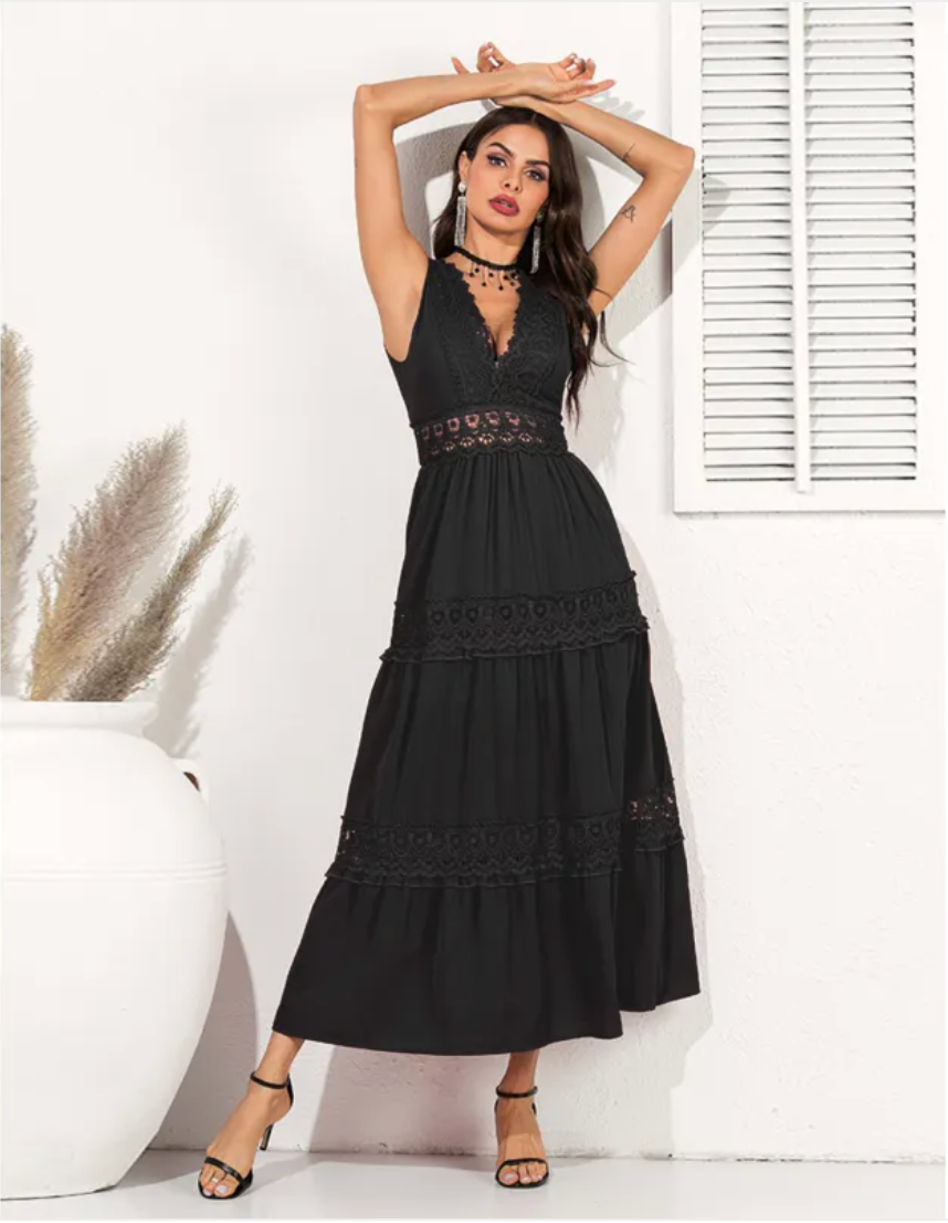 Höj din stil med Maja™, den luftiga maxiklänningen i finaste spets. Med sin förföriska V-ringning och flödande silhuett skapar den en look som andas både romantik och tidlös finess – perfekt från strandfester till sommarbröllop.